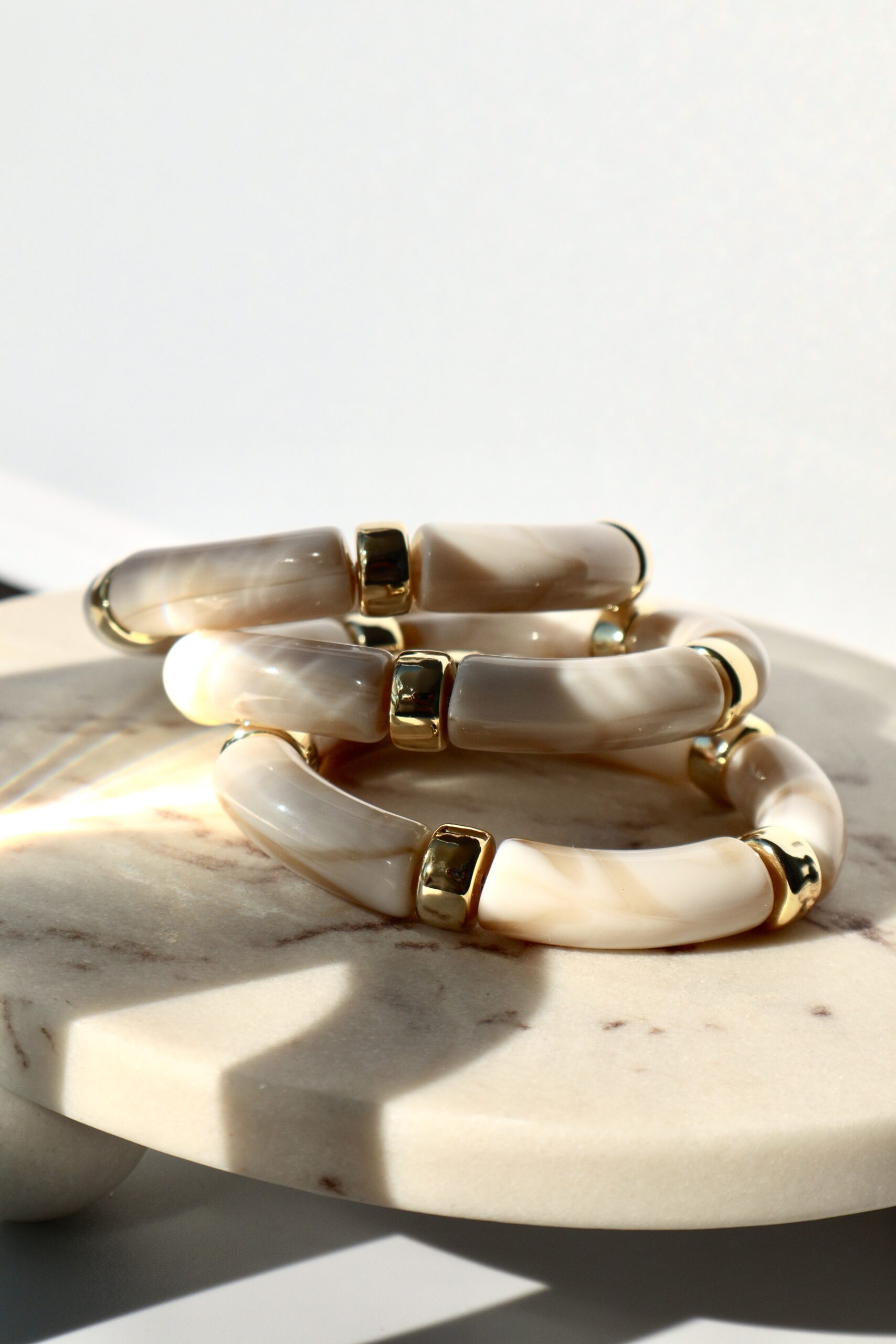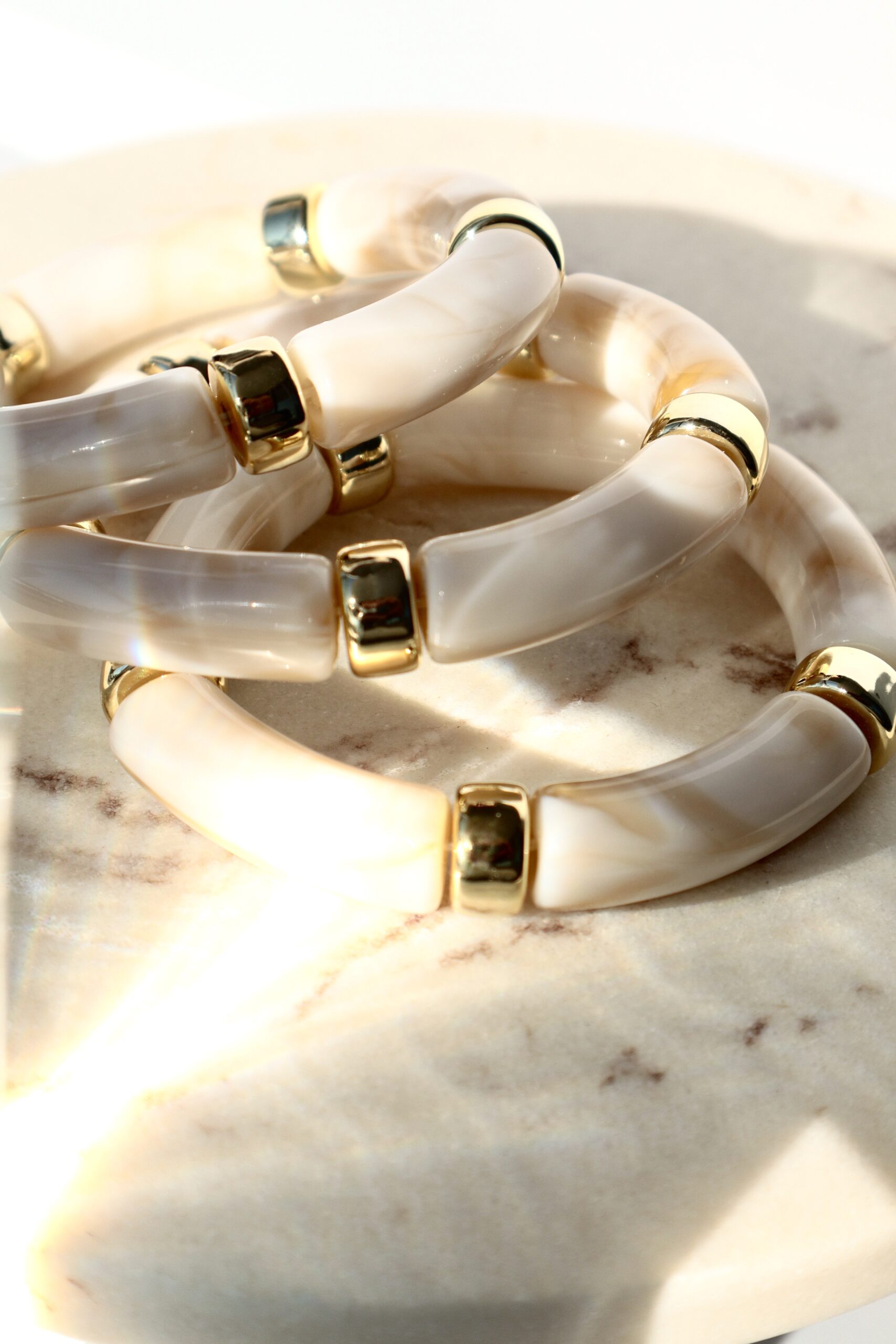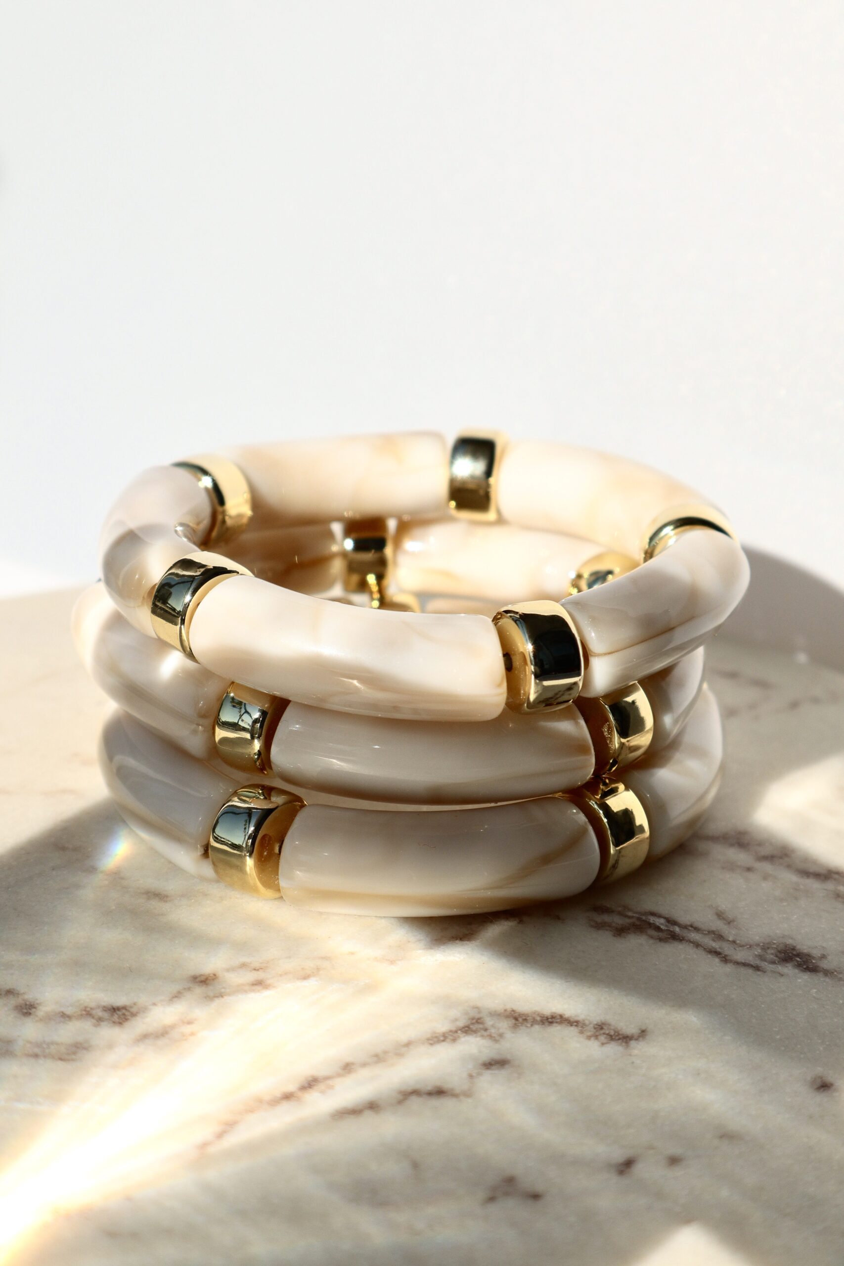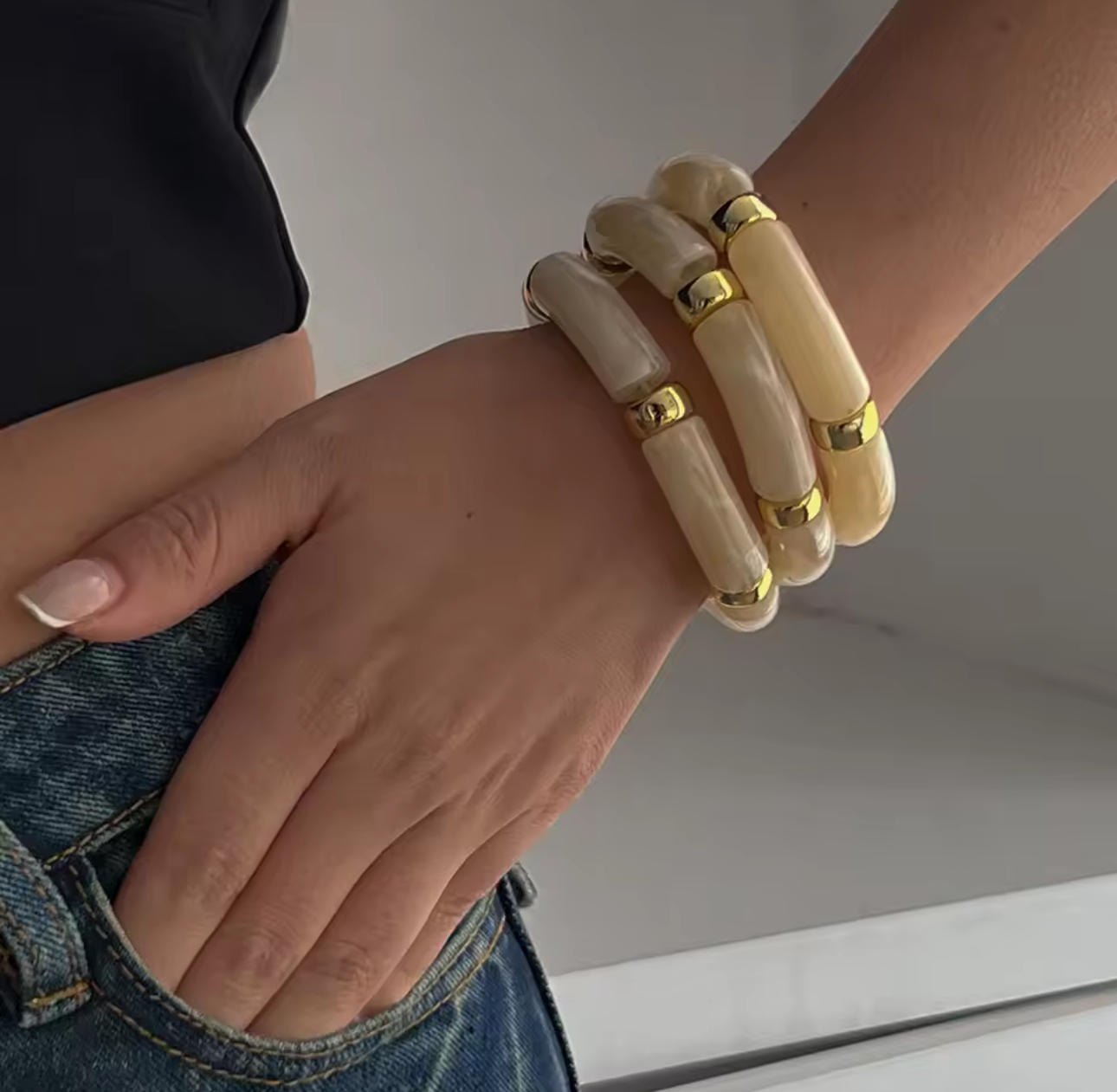 A chic and versatile bracelet featuring smooth ivory acrylic beads inspired by bamboo. Lightweight, durable, and perfect for layering or wearing solo for effortless style.