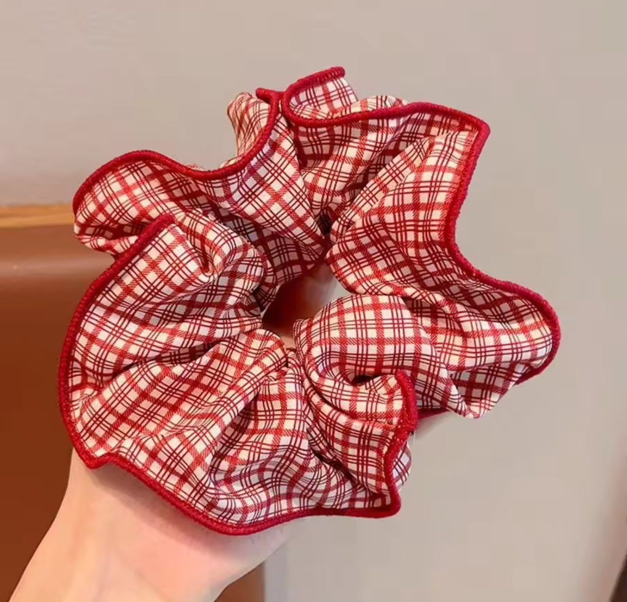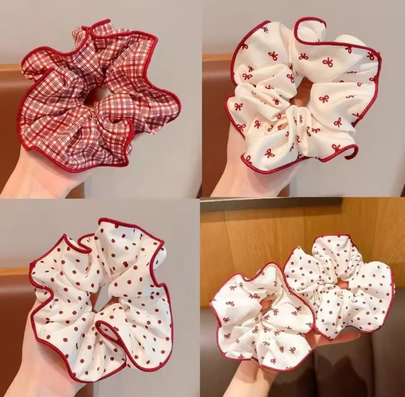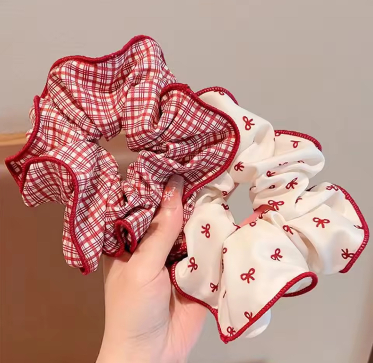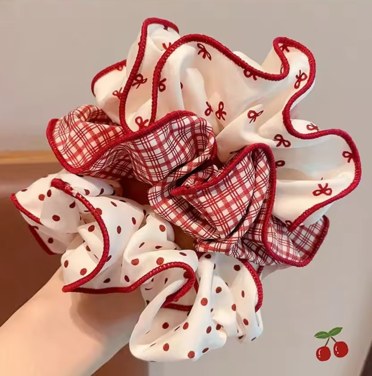 A cute and classic 3-piece scrunchie set featuring red plaid, bow, and polka dot designs. Made from soft, gentle fabric that holds hair securely without damage — perfect for adding a playful vintage touch to any look.